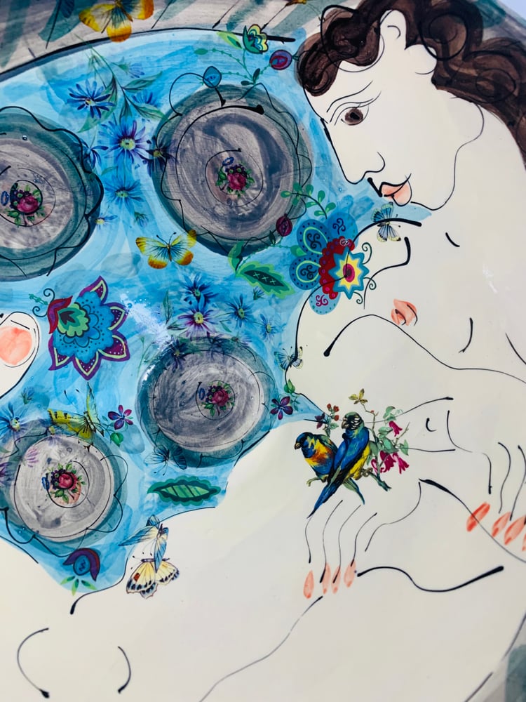 Large grey and bowl bowl with figurative decoration with birds,flowers and butterflies 31cm wide and 19 cm high
