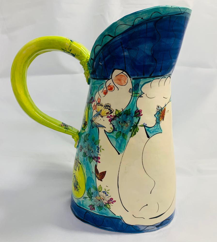 Large figurative jug with a green handle , decorated with birds and flowers. 27 cm high and 21 wide to the handle.