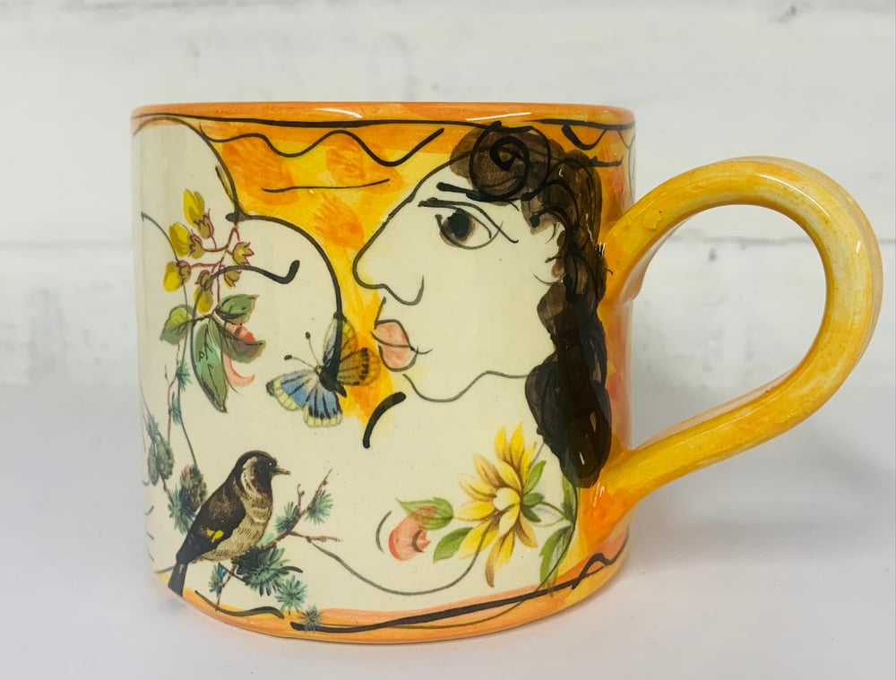 Light orange figurative cylinder mug with flowers, birds and butterflies.