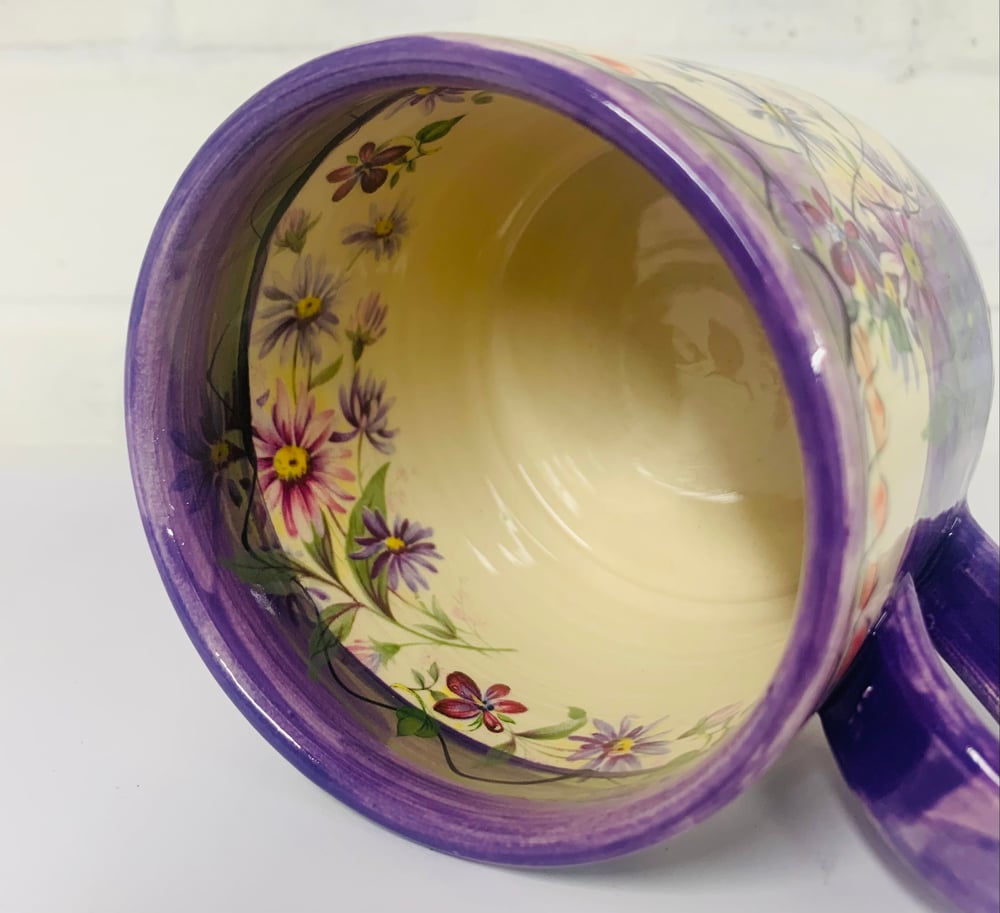Purple cylinder figurative mug with birds, flowers